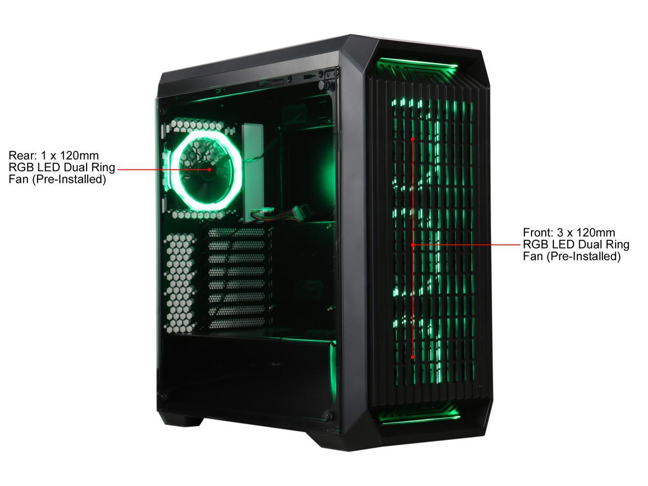 - Pre-installed 4 x RGB LED Dual Ring Fan (7 different color in 3 modes control- circularly flashing, breathing and stable) provides great cooling and dynamic cyber gaming atmosphere