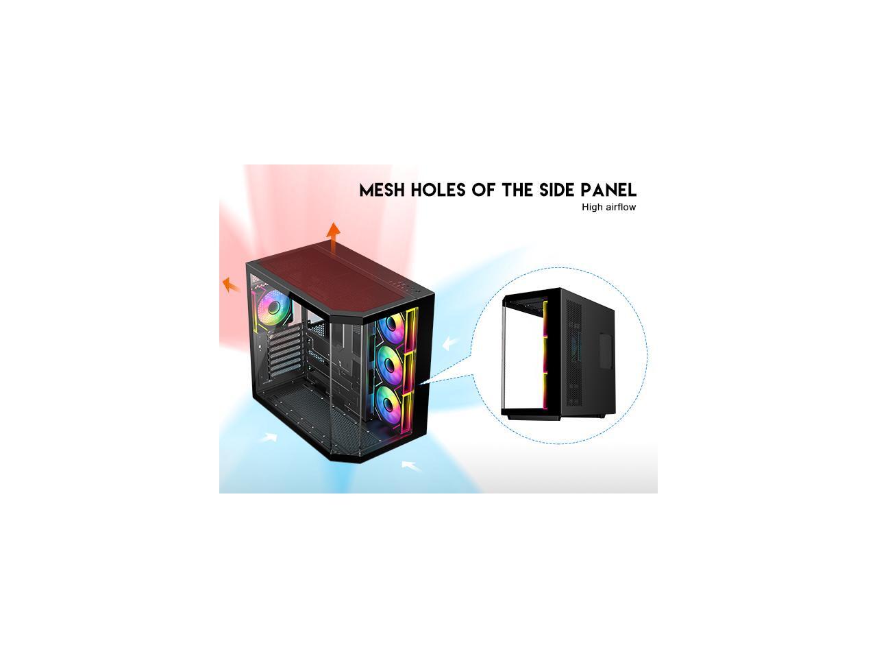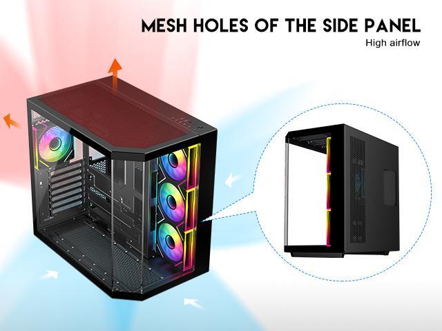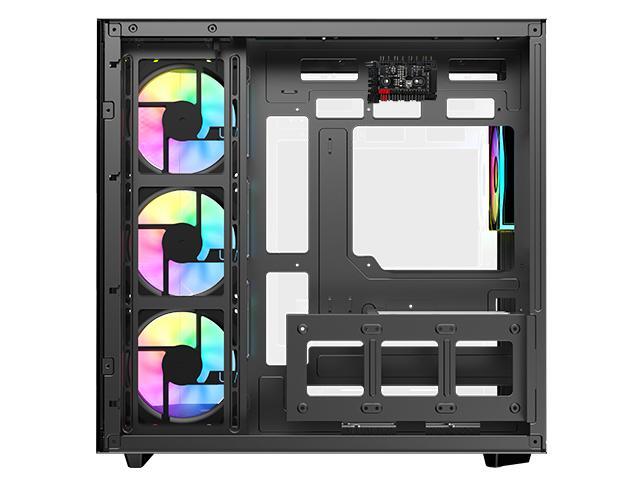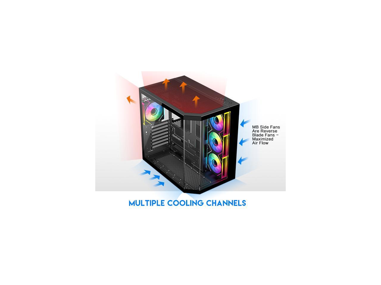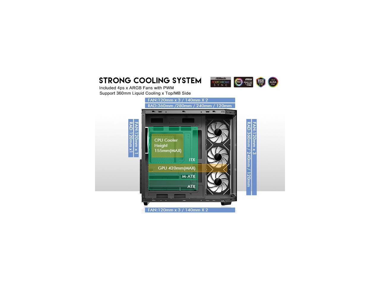 - 10 Fans Capability (3 x 120mm ARGB Reverse Blade PWM Fan x MB side, 1 x 120mm ARGB PWM Fan x rear pre-installed) Provide Great Cooling and Gaming Performance