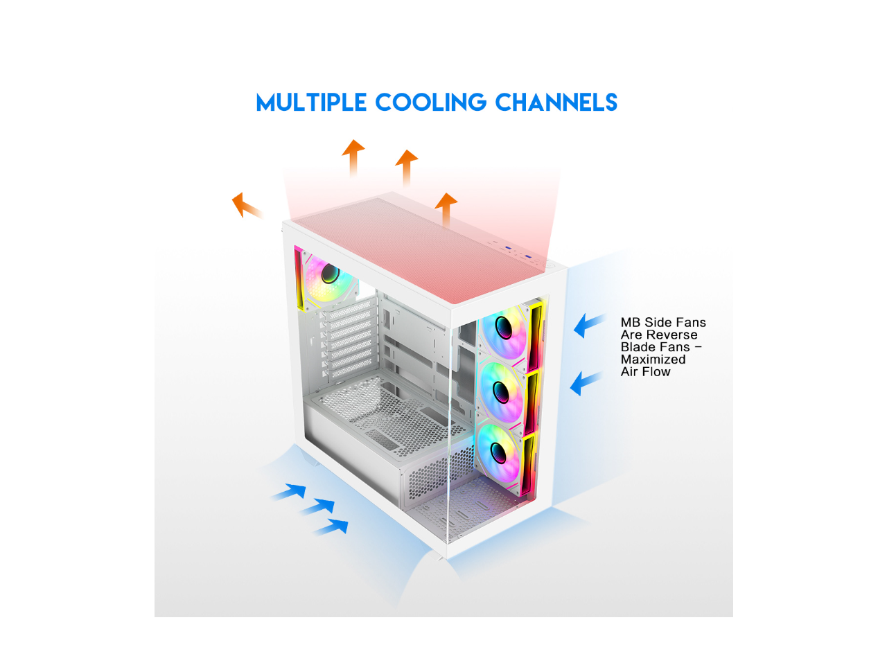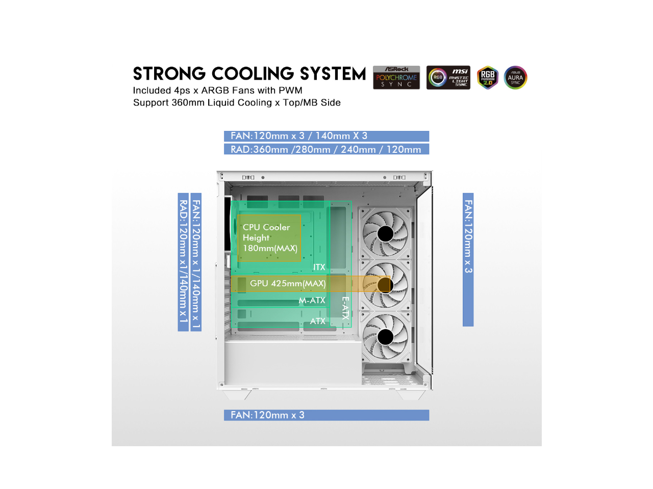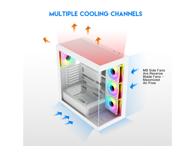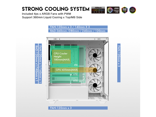 - 10 Fans Capability (3 x 120mm ARGB Reverse Blade PWM Fan x MB side, 1 x 120mm ARGB PWM Fan x rear pre-installed) Provide Great Cooling and Gaming Performance