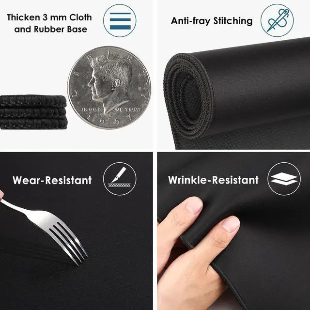 The cloth surface prevents scratches from sharp objects such as cutlery and pens. Black surface will not become dirty in color after long time use.