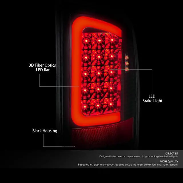 - PACKAGE INCLUDES: A Pair of Red 3D LED Light Bar Style Black Housing Tail Lights For Left and Right Side; LED Resistor Box to Prevent Hyperflash
