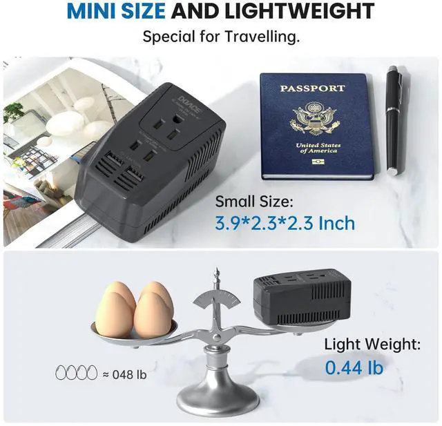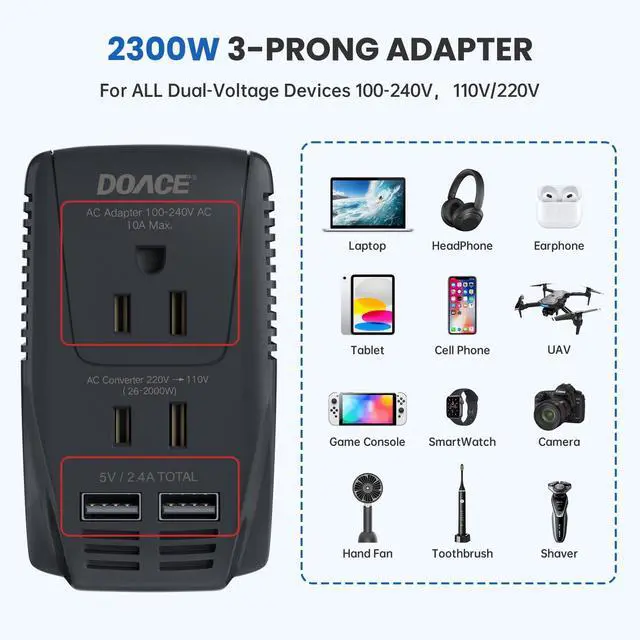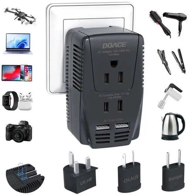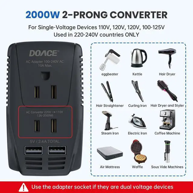 2000W 220V to 110V Converter & 2300W Travel Adapter & USB-A & USB-C