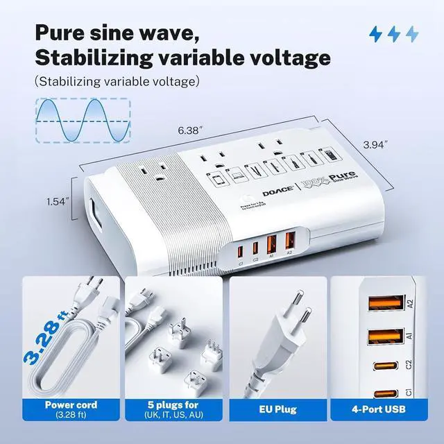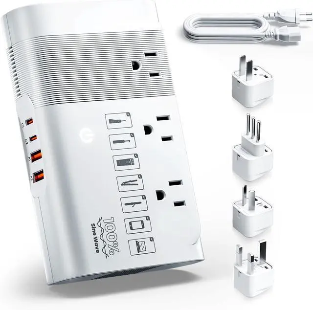 Safe Voltage Conversion with Pure Sine Wave Step-down 220-240V to 110V for US devices. Protect laptops, cameras, CPAP machines, and other sensitive electronics. Built-in fuses, surge protection, and silent fan ensure safe and reliable operation at home or abroad.