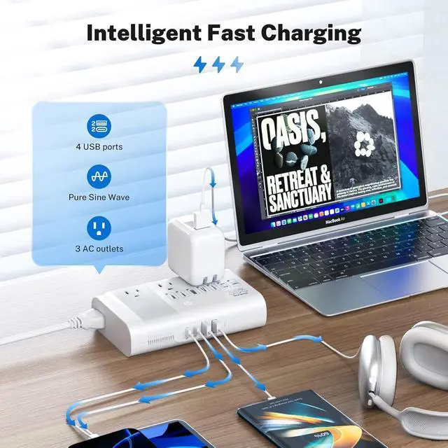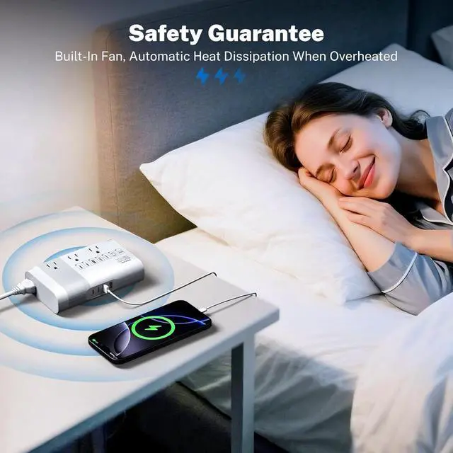 Charge Up to 7 Devices at Once 3 US outlets, 2 USB-C (20W PD), 2 USB-A (18W QC). Fast-charge phones, tablets, laptops, mini hair dryers (<500W) safely. Perfect for families, business trips, or hotels.