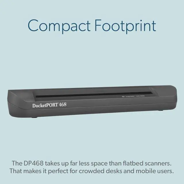 - Ultra-Compact Footprint: The DocketPORT 468 boasts a space-saving design similar in size to a three-hole punch making it ideal for tight desk spaces and mobile professionals.
