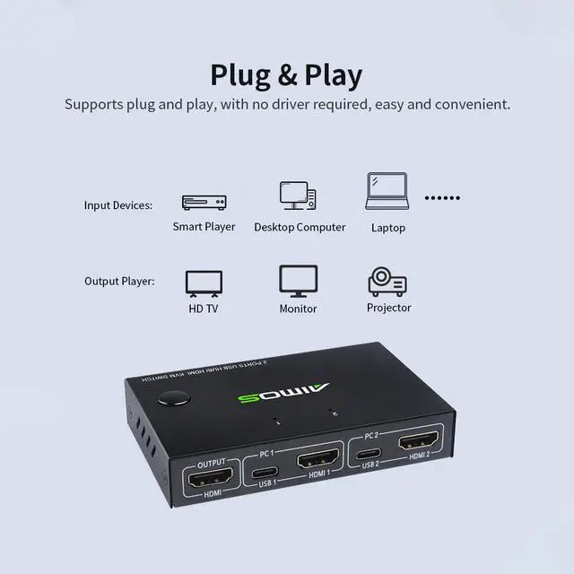 2-port KVM switch enables to freely switch 2 groups of high-definition video source and USB interface. Adaptive EDID/HDCP decryption, with excellent image processing and transmission capacity, makes the output signal more smoother and stable, a reliable, high performance and efficient way of HDMI USB switch. Suitable for office, computer room, monitoring host, etc.