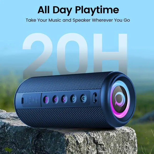 Bluetooth 5.4 & 20H Playback Time: The portable Bluetooth speaker has the latest Bluetooth 5.4 chip built in to ensure fast pairing and a stable connection. This Bluetooth outdoor speaker lasts all day and can play for up to 20 hours per charge50% Volume. You can turn on/off the multi-colored light by clicking the "light button" on the surface to meet your needs and extend battery life. Actual playback time varies depending on volume, audio content and usage.