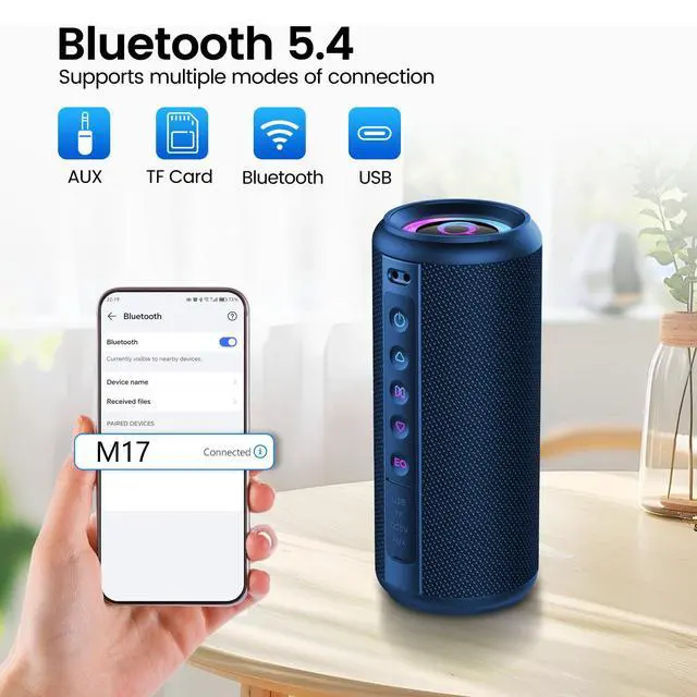EQ Mode & RGB Colorful Light: M17 Bluetooth wireless speaker that changes the sound output of the speakers by adjusting the sound of different frequencies (e.g. bass, midrange, treble). Allows you to personalize your choices and optimize your music listening according to your personal preferences or different scenarios. And it comes with personalized adjustable LED lights.When playing music, there are eight types of lights that loop back and forth, allowing you to enjoy music better.