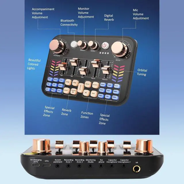 1. Multifunctional Sound Mixer: Featuring four independent volume knobs and five slider knobs, our mixer allows accurate control over bass, mid, treble, accompaniment, and monitoring, with breathing lights that sync to your volume, enhancing live broadcasts and podcasts.