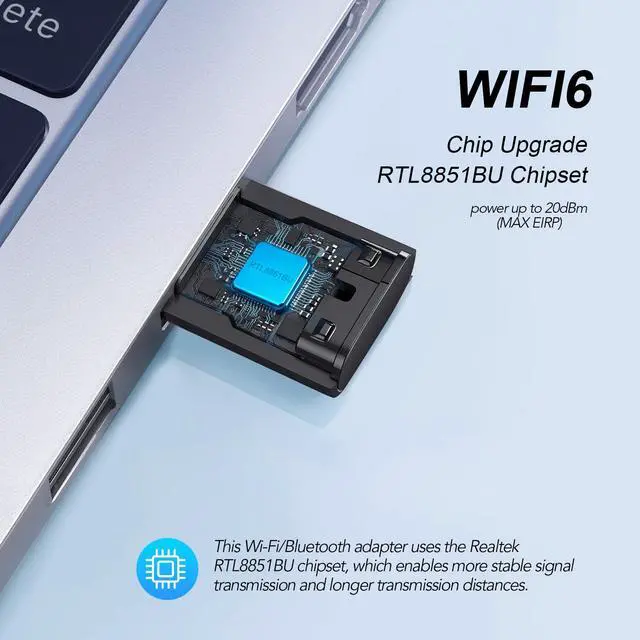 This Wi-Fi/Bluetooth adapter uses the Realtek RTL8851BU chipset, which enables more stable signal transmission and longer transmission distances.