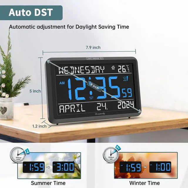 The day of week clock will adjust for daylight saving time automatically during DST time, no resetting hassle for seniors and the elderly, making it an easy to use digital day date time clock for seniors.