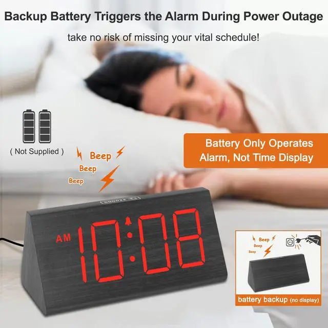 Battery Only Operates Alarm (AAA alkaline battery not included) --- The electric clock will trigger the alarm during power outage and wake you up on time, making it a reliable bedside alarm clock. Clock setting will also be stored but the clock time won't show on the display.