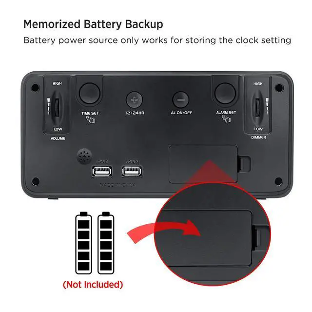 NOTE: Power adapter is required as the power source of this product and batteries (not included) only work for storing the clock settings in the case of power cut.
