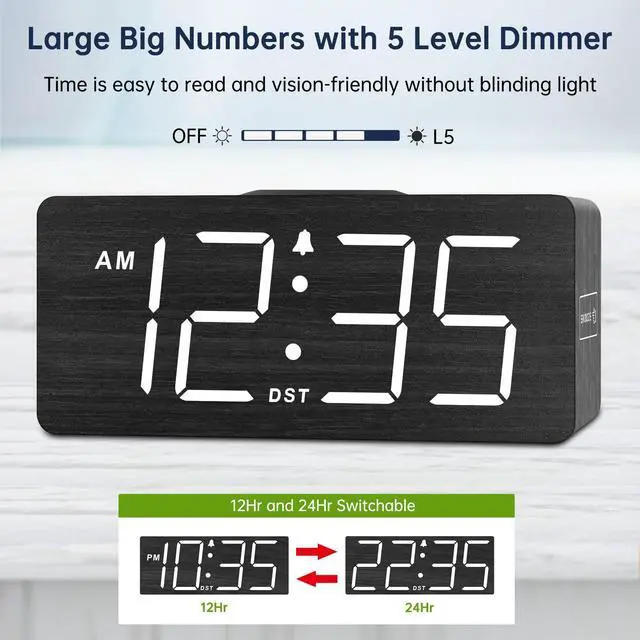 The modern alarm clock delivers digits in large and vision friendly way, time is ultra easy to see from afar without glasses which is great for seniors, elderly and adults. The stylish wood design makes it a perfect digital clocks for bedrooms, living room, office and as a room decor.