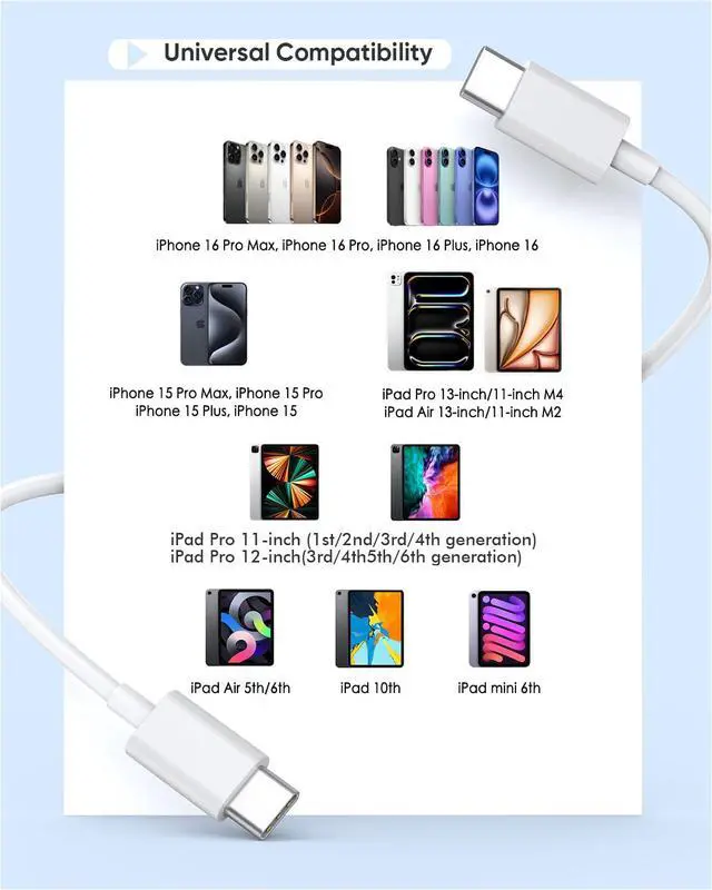 | Compatible Devices | iPhone 16e, iPhone 16, iPhone 16 Pro, iPhone 16 Pro Max, iPhone 16 Plus, iPhone 15, iPhone 15 Pro, iPhone 15 Pro Max, iPhone 15 Plus, iPad Pro 13-inch M4, iPad Pro 11-inch M4, iPad Air 13-inch M2, iPad Air 11-inch M2,iPad 10th, iPad Air 4th/5th, iPad mini 6, iPad Pro 12.9-inch 3rd/4th/5th/6th, iPad Pro 11-inch 1st/2nd/3rd/4th; C cable support MacBook, AirPods Pro Samsung, Google c-port charger device. |