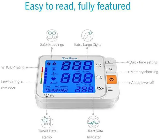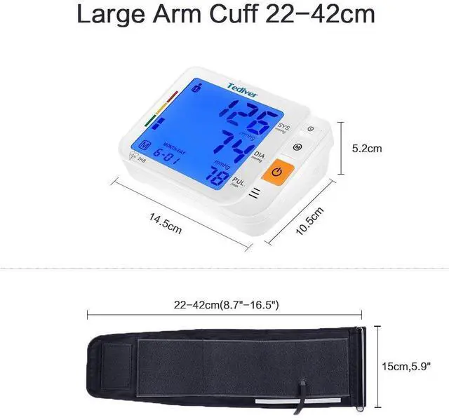 Adjustable & Large cuff fits standard and large adult arms; large backlight LCD screen, extra-large digits and and colored BP Level bar, super easy for you to read and compare blood pressure and heart rate