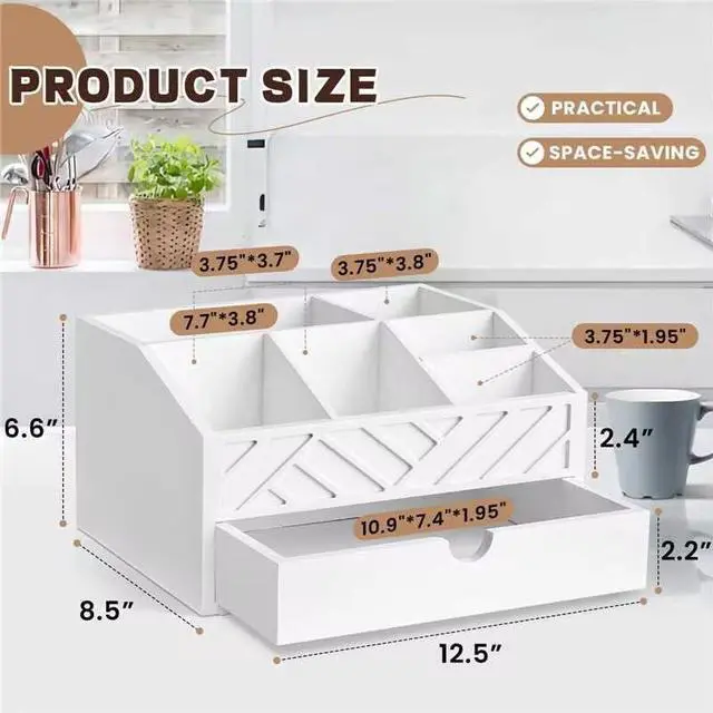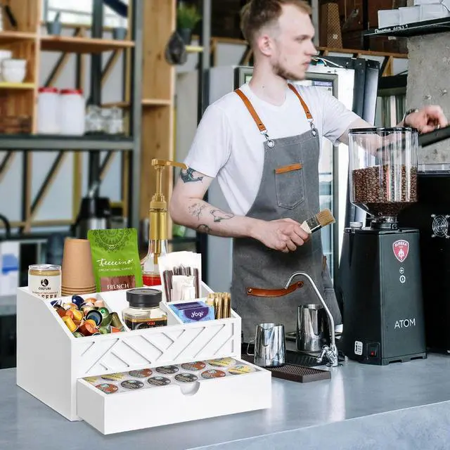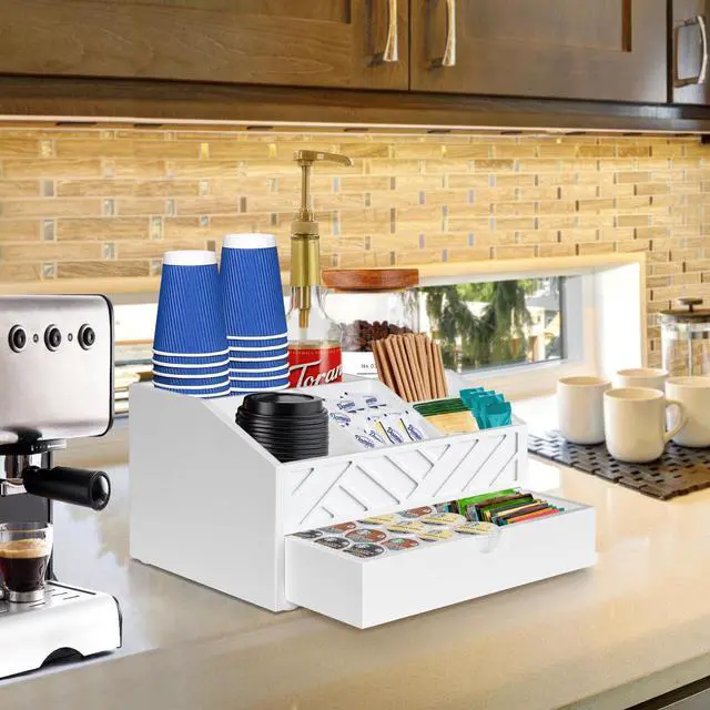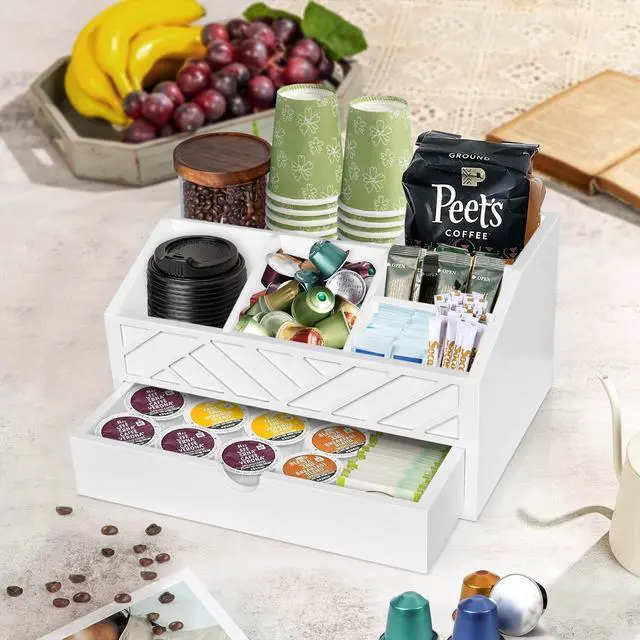 The coffee bar organizer is strategically designed with 7 compartments and a drawer, making it versatile for storing various items such as tea bags, coffee syrup, cups, straws, stir sticks and other coffee bar accessories. The drawer is easy to pull out and can accommodate coffee pods of most sizes.