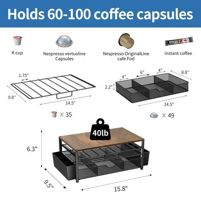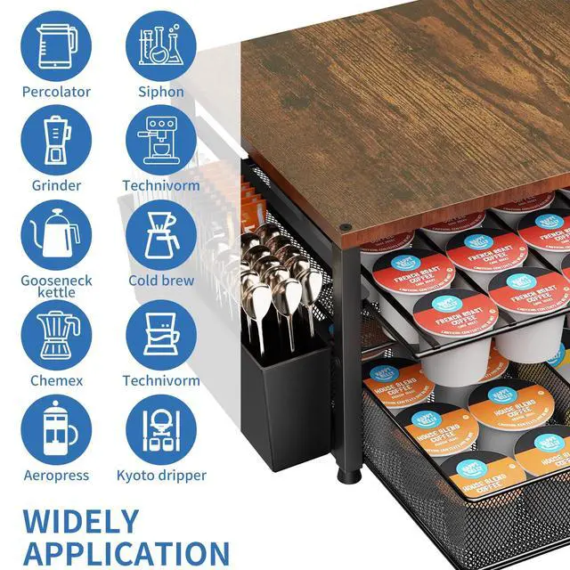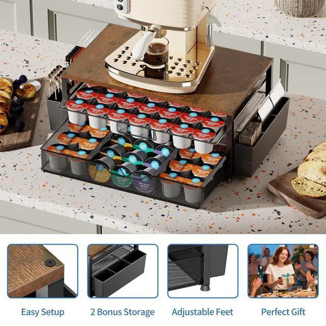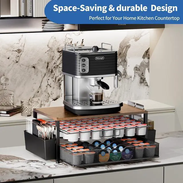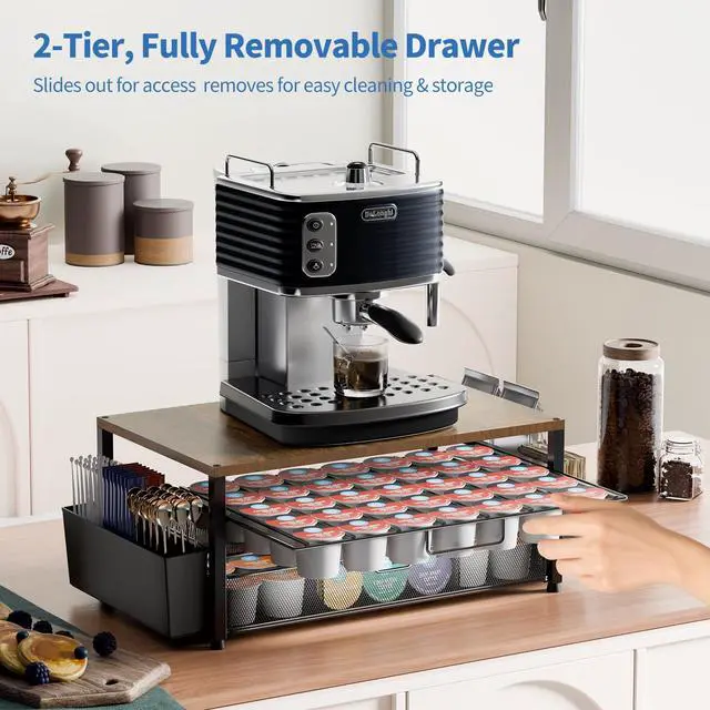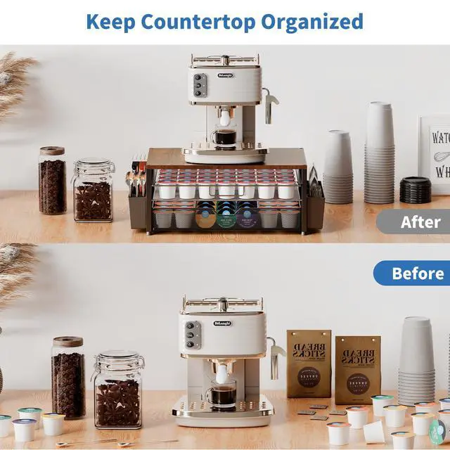 Tired of messy coffee stations? Our all-in-one K cup holder, with a max 80 pods capacity, instantly organizes your K-Cups and accessories, creating a calm and efficient countertop. Enjoy an orderly beginning to your energized mornings with quick, tool-free assembly.