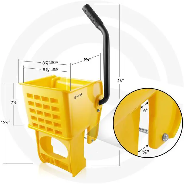 Compatible with 26-qt and 33-qt Dryser commercial mop buckets and select side-press commercial mop bucket systems. Easy installation on existing buckets. Mop bucket not included. Easy to install onto existing mopping buckets. It features universal mount points to accommodate a wide range of models, providing flexibility and convenience. The ergonomic, heavy-duty wringer handle has been designed to operate easily and with minimal effort. Additionally, the shape and position of the handle allows for smoother steering. Ideal for home, office, industrial, and professional environments.