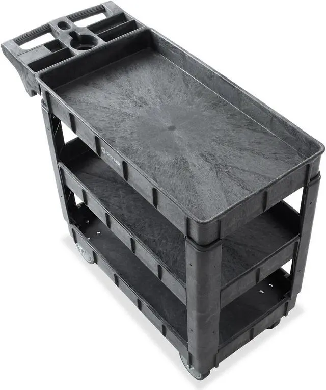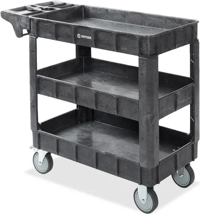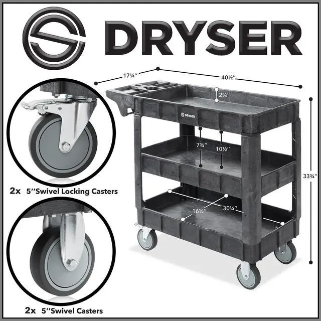 The Dryser utility cart boasts a commercial-grade powder-coated finish, ensuring resistance against scratches, rust, and corrosion, enabling it to handle heavy loads. With a maximum weight capacity of 550 lbs. and 2-3/4" deep shelves, it facilitates efficient organization and storage of various items. Equipped with four 5" caster wheels, the cart provides smooth mobility across diverse surfaces. Its built-in molded handle enhances maneuverability, featuring small compartments for extra tool storage and a metal bar underneath for hanging items like rags or towels. Designed for versatility, this cart finds application in workshops, garages, factories, warehouses, offices, and outdoor settings.