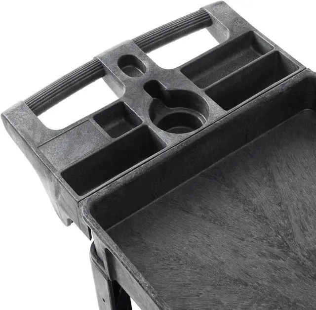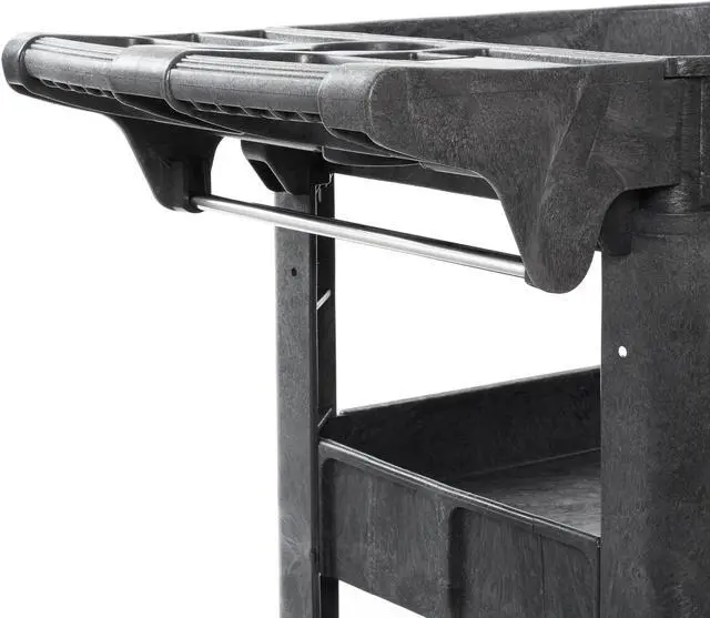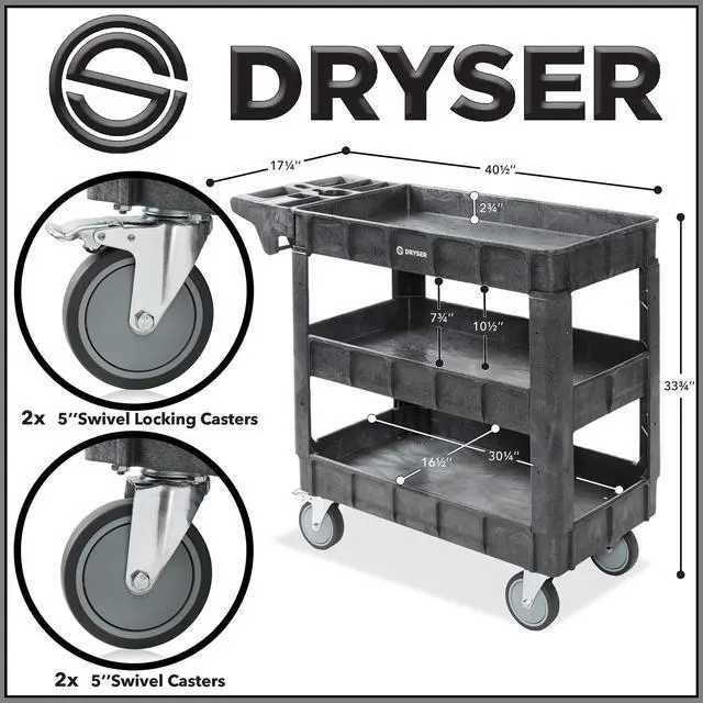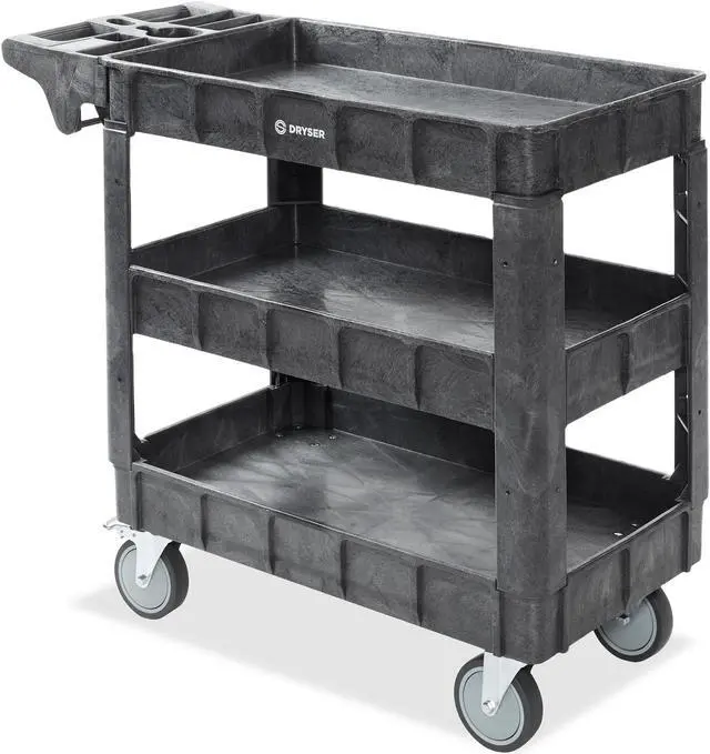 The Dryser utility cart boasts a commercial-grade powder-coated finish, ensuring resistance against scratches, rust, and corrosion, enabling it to handle heavy loads. With a maximum weight capacity of 550 lbs. and 2-3/4" deep shelves, it facilitates efficient organization and storage of various items. Equipped with four 5" caster wheels, the cart provides smooth mobility across diverse surfaces. Its built-in molded handle enhances maneuverability, featuring small compartments for extra tool storage and a metal bar underneath for hanging items like rags or towels. Designed for versatility, this cart finds application in workshops, garages, factories, warehouses, offices, and outdoor settings.