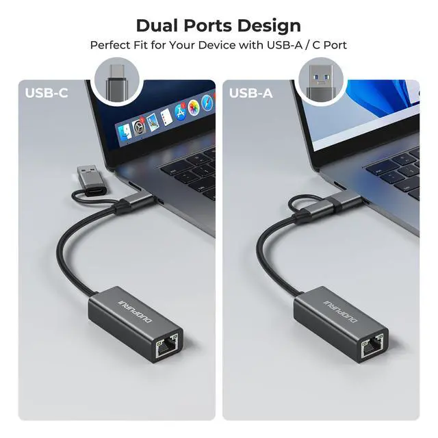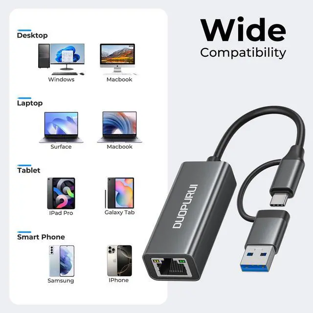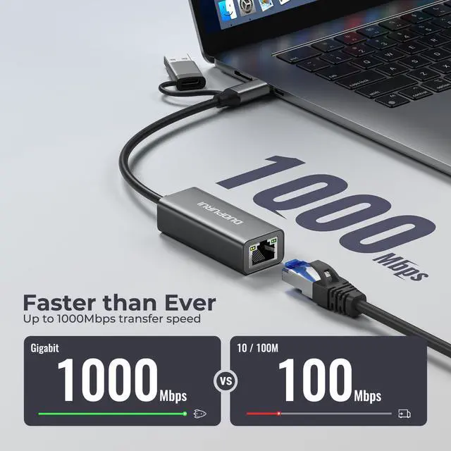 USB to Ethernet AdapterThis DUOPURUI usb to ethernet adapter adds a Gigabit RJ45 Ethernet port to your device, easily resolving issues where your computer lacks a built-in Ethernet interface or has a damaged existing port. It helps you quickly restore a stable and reliable wired network connection