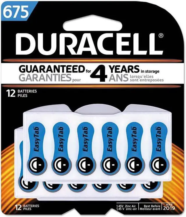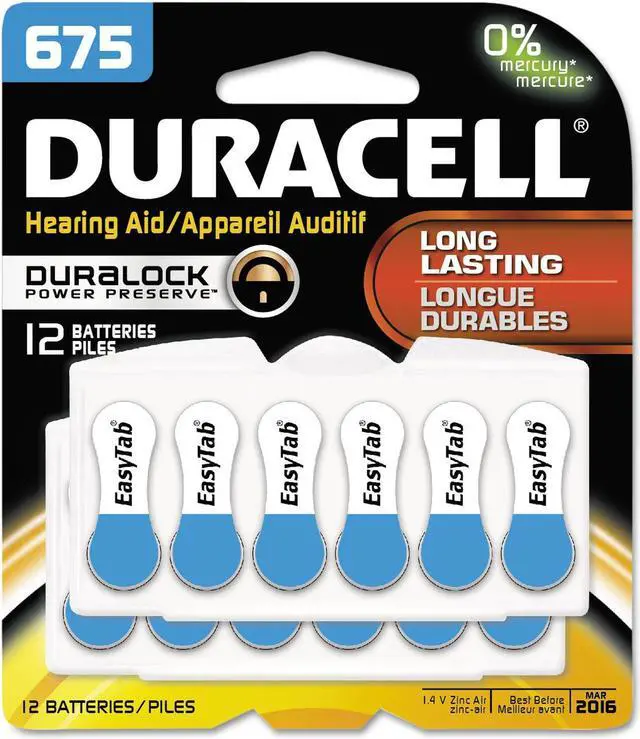 Hear every moment with long-lasting power in Duracell Hearing Aid Batteries. The Duracell Hearing Aid battery tab is extra-long, so its simple to handle, and its packaging is easy to open. Batteries are color-coded, making it easy to find the size thats right for you. You get peace of mind knowing Duracell is the #1 recommended by the Arthritis Foundation for ease of use. Plus, Duracell Hearing Aid Batteries will last up to four years in storage. Size 675Blue. Battery Type: Lithium; Battery Size: 675; For Use With: Hearing Aid; Voltage: 1.45 V.