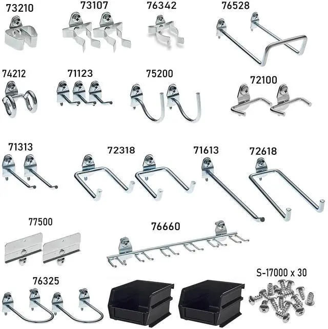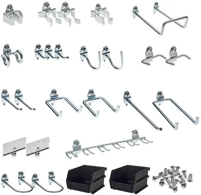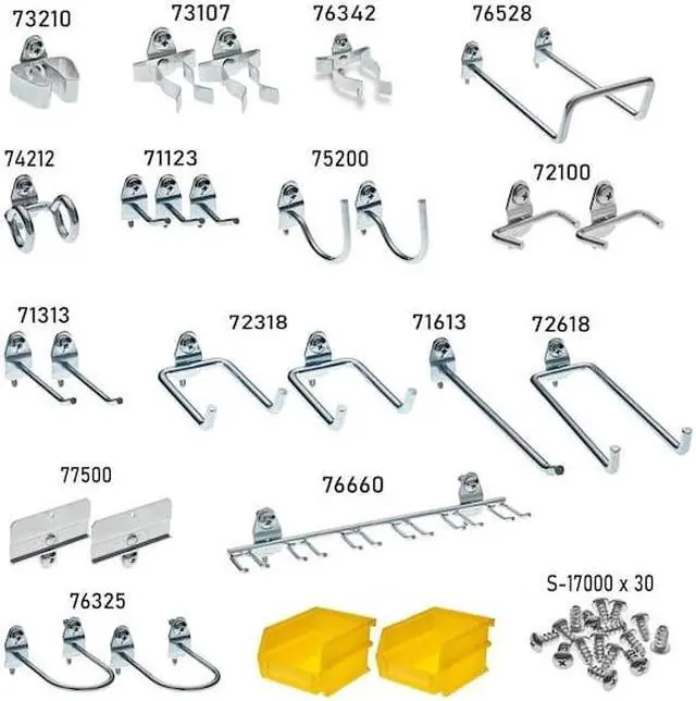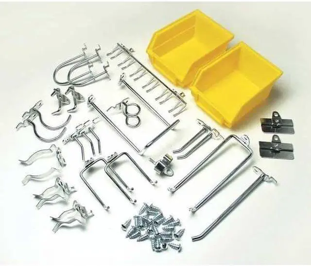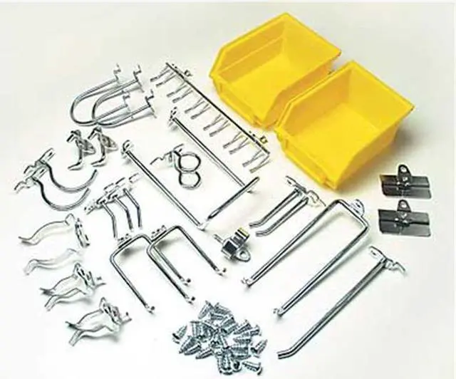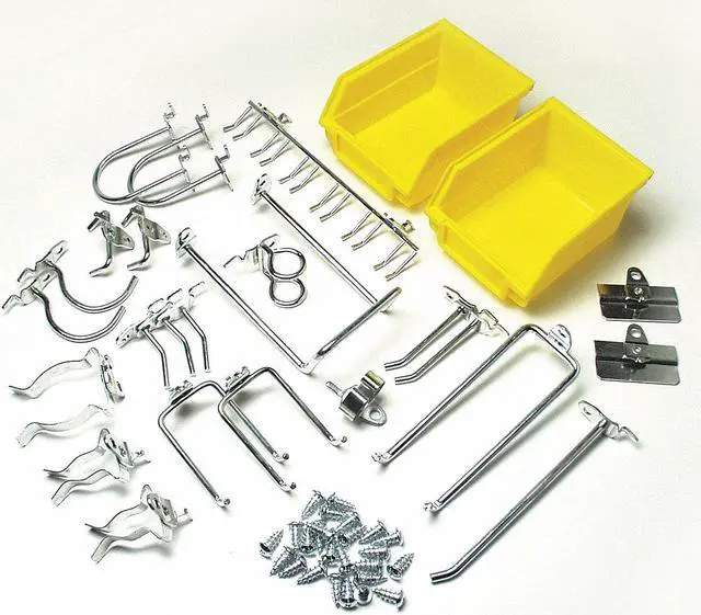 Hooks And Hanging Bins, Number of Bins 2, Number of Hooks 24, Overall Height 6 in, Overall Length 10 in, Overall Width 6 in, 10 in Hook Depth, Surface, Screw-In Locking System, Circle For Pegboard Hole Shape, Steel, Silver, Yellow, Zinc-Plated, Hook and Bin Assortment Kit Accessory Type