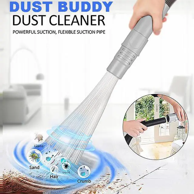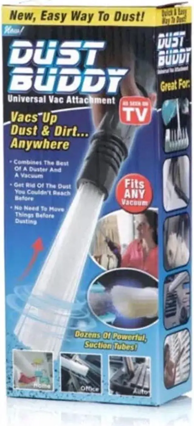 The new cleaning tool intended to get dust out of every corner and crevice. The Dust Buddy is a universal vacuum attachment fits any vacuum. The Dust Buddy features a dozen individual suction tubs that are flexible and can reach anywhere that dust hides. Each suction tube acts sweeps & vacuums away dust from fine objects to hard-to-reach corners, edges and grooves.