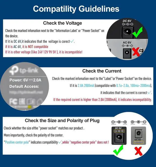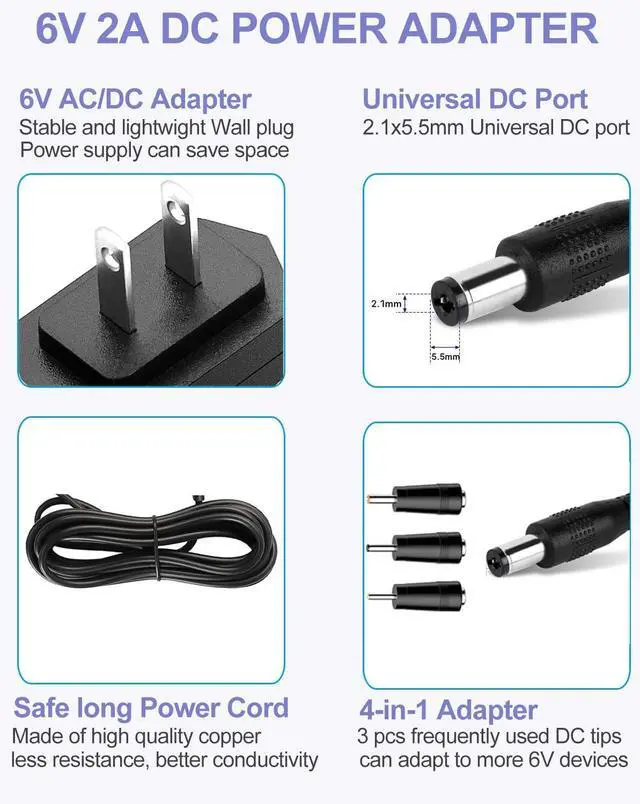 Package includes: 1 x 6V 2A ac/dc adapter 3 x DC tips. Built-in multiple safety protection systems and safe to use. If you have any questions about the product please do not hesitate to consult us before returning. We always support and provide excellent after-sales support!