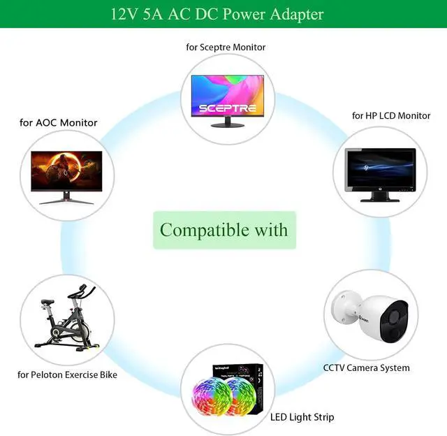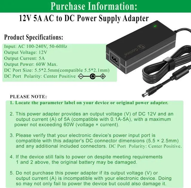 Power Supply Compatibility: ] The Gonine 12V 5A AC DC Power Supply Adapter Powers a vast range of 12v 5a 4a 3a 2a 1a devices such as 12vdc 5050 3528 LED Light strips for dc12v Aoc Sceptre HP LCD monitors for 12 volt Lorex Night Owl Swann ZOSI Reolink Annke cctv camera security system DVR NVR HVR 12vdc routers dc12v speakers. The 8 included tips ensure you find the right fit for your electronic device. [Product Specifications] Experience stable and reliable power with this 60W max output adapter delivering a consistent 12V 5A DC current. It features worldwide AC voltage compatibility (100-240V 50/60Hz) making it ideal for international use without a separate converter. Main Power DC Port of size: 5.5 * 2.5 mm (compatible with 5.5 * 2.1 mm). [Key Features] Built with multiple protections including safeguards against over-voltage over-current short-circuit and over-temperature. This ensures extended safety for both your connected devices and the adapter during prolonged operation preventing flickering or performance issues. [Important Notes] Please verify your device's required voltage (12V ) and current (5A and below) and the correct DC connector size before purchase to ensure compatibility. The included power cord features a US plug. [What's in the