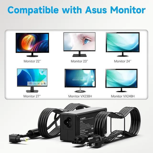 USA: VS Series VS248H-P VS247H-P VS239H-P VS228H-P; VG Gaming Series VG248QE VG245H VG278Q VG258Q. Restores power to your screen instantlyCompatible with ROG & VX/MXFits ROG Swift PG278Q PG279Q PG258Q PG278QR (G-SYNC Gaming); MX Series MX279H MX259H MX239H; VX Series VX238H VX238H-W VX228H VX248H VX279Q. Provides clean stable power for flicker-free displayHeavy Duty 65W PerformanceCapable of delivering up to 65W. It runs cooler and lasts longer than standard 40W adapters because it isn't constantly running at max capacity.