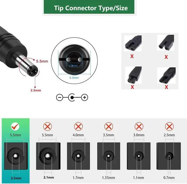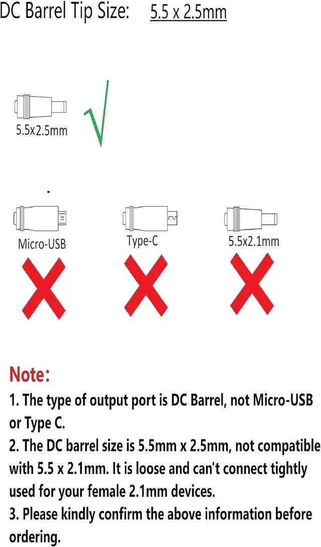 ? 5.5 mm x 2.5 mm Barrel PlugDC tip connector size is 5.5 mm x 2.5 mm. NOT Compatible with 5.5 mm x 2.1 mm 4.0 mm x 1.7 mm 3.5 mm x 1.35 mm 3.0 mm x 1.1 mm and 2.5 mm x 0.7 mm.? Barrel Connector End It will be connected to your devices is a DC Barrel not a micro-usb mini-usb usb type c proprietary port of Clipper interface port.? not proprietary for Clippersit is a common 5V ac/dc adapter not a constant current and constant voltage 5V power supply.? 100-240 V