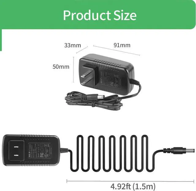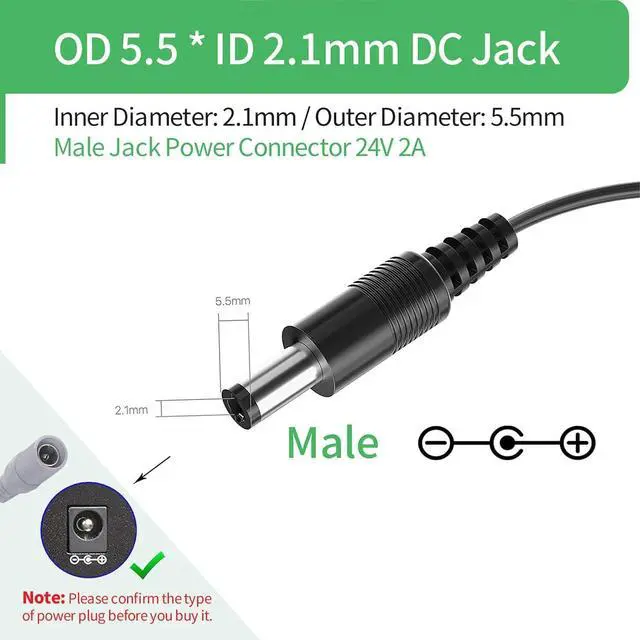 Connector Size: 5.5 mm x 2.1 mmWidely used: This 24V 2A power adapter is widely used for LED Strip Lights Router Electronic Piano Keyboard DVR NVR Surveillance System Security CCTV Camera Portable Radio Digital Photo Frame External Hard Drive Foot Back Neck Shoulder Massager Video Baby Monitor Mini Fan and more 24V devices. FCC UL certificate WEEE RoHS.