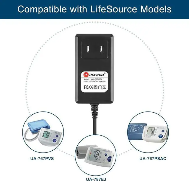 Voltage Range: AC 100V - 240V 50-60Hz. AC Connector 5.5 mm* 2.5 mm. COMPATIBILITYPKPOWER AC Adapter for LifeSource UA-631 UA-767 UA-767T UA-767TL UA-767PV UA-767PVL UA-767PVS UA-767PAC UA-767PLAC UA-767PSAC UA-851AC UA-851V UA-851VL UA-853 UA-853AC UA-853LAC UA-1020 UA-774 UA-774AC UA-787 UA-787EJ UA-851. LifeSource UA-767 787 and 774 Series Digital