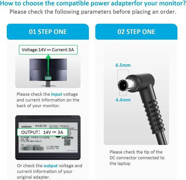 Output: DC 14V 3A 42W Max compatible with all currents less than 3A 42W such as 2.5A 35W 2.14A 30W 1.78A 25W. It will NOT work with 14V 3.5A /4A monitor models such as Syncmaster SA850 P2770. Never run it overload! Otherwise it will be damaged soon14V Power Supply for dc14v S27a350h S20D340H S20D340HY S22D300BY S22D300HY S22D300NY S22D340HY S24D300HL S24D340H S24D340HL S27B550 T24E310ND TFT LCD Monitor; 150MP UE590 B300 S22A300B S20A350B S22A100N S24B300HL C27F591 S24A450B S24A450BW 24 LED Monitor S24A850DW 24 850 Series LED Monitor S27A850D S27C230 S27C230B 27 850 Series Business LED MonitorCompatible with S24A300B S24E390HL S24E310HL S24E370DL CF591 C27F C27F591 C27F591F C27F591FD C27F591FDN LC27F591FDN XZA S27E510C S27A350H S27B350H S27B350 S27b550V S27E330H S27E310H s27d360h LS27A650DS SYNCM170T SYNCM171P SYNCM172B SYNCM172MP SYNCM172S SYNCM172T SYNCM180T SYNCM191T SYNCM192T SYNCM570S SYNCM570V SYNCM700TFT SYNCM760V SYNCM770TFTCompatible for most LCD Monitors which the Output is DC 14Volt such as 150MP UE590 B300 S22A300B S22C300 S22C300H S20A350B S22A100N S24B300HL S24D590PL C27F591 F22T350FHN LF22T350FHNXZA A2514_RPN AD-3014 A3514-DPN AD4214N BN44-00989A. Check product description page for more compatible modelsPackage