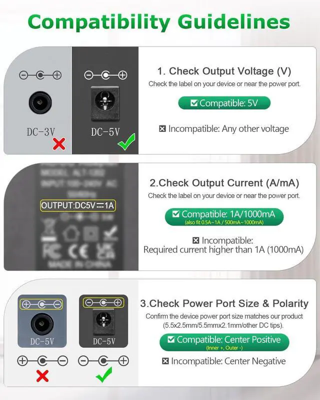 Package includes: 1 x 5V 1A ac/dc adapter 8 x DC tips. Built-in multiple safety protection systems and safe to use. If you have any questions about the product please do not hesitate to consult us before returning. We always support and provide excellent after-sales support! Please carefully check the type of tip you need before purchasing!!!