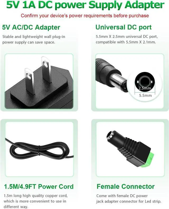 DC Plugs: 5.5 x 2.5 mm (compatible with 5.5 x 2.5 mm) 4.0 x 1.7 mm 3.5 x 1.35 mm 3.0 x 1.1 mm 2.5 x 0.7 mm Micro-USB Type-C terminal connector which expands the application range of the adapter to a greater extent. Please reconfirm the DC jack size before purchase and use to ensure compatibility. 5V 1A power adapter would meet your 90% power need for 5V household and office electronics like portable bluetooth wireless receivers electrical toys WS2812B WS2811 LED strip lights games consoles kids 4 wheeler GPS DVR webcam speaker CCTV camera lan phones laptop cooler external speaker video baby monitor mini fan Router Kindle Fire Table hard disk boxand more 5V devices. Not a phone/laptop chargerMuch more sturdy design than the others this adapter was the perfect replacement for your lost 5V power cord. 5V adaptor manufactured with the highest quality materials and include multiple safe guarding against over voltage short circuit internal overheating.