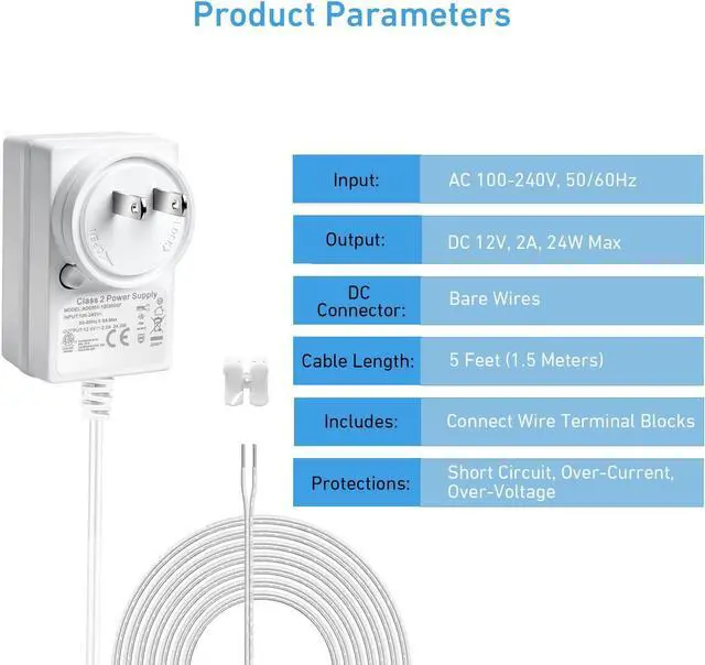INPUT: DC 12V). Do not purchase if your device requires 5V 9V 24V or 110V AC as it will not work and can cause damage. Easy Installation Comes with bare open wires (Wire: Black= ''+ '' White='' -''). Includes FREE quick-connect wire terminals for secure screw-free connections. Solves the problem of wrong plug or would not connect properly. Easily screw the wires of the device together without soldering or electrical experience. 24 watt ac dc Power Adapter 24W MAX Delivers a stable 2 Amp (2000mA) / 24 Watt output.