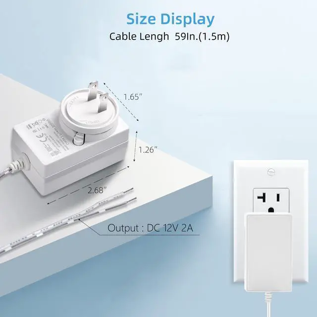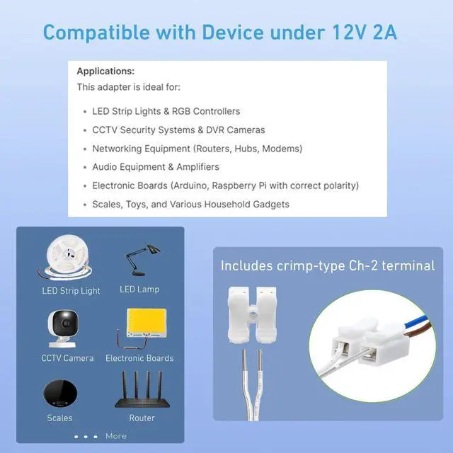 Please Note: If your device (e. g. a long bright LED strip) requires more than 24W this adapter will not provide enough power and may shut down. Check your device's wattage requirement first. Compatibility Gallery Powers 12V LED Strip Lights (check length/wattage! ) Karaoke Machines Wireless Speakers CCTV Cameras Routers Modems and other low-voltage electronics. Not for use with motorized blinds large amplifiers or 24V equipment. You Will Get1x 120v to 12v 1A transformer (White) 1x type CH-2 terminal. If you have any questions or suggestions Share your ideas with us here