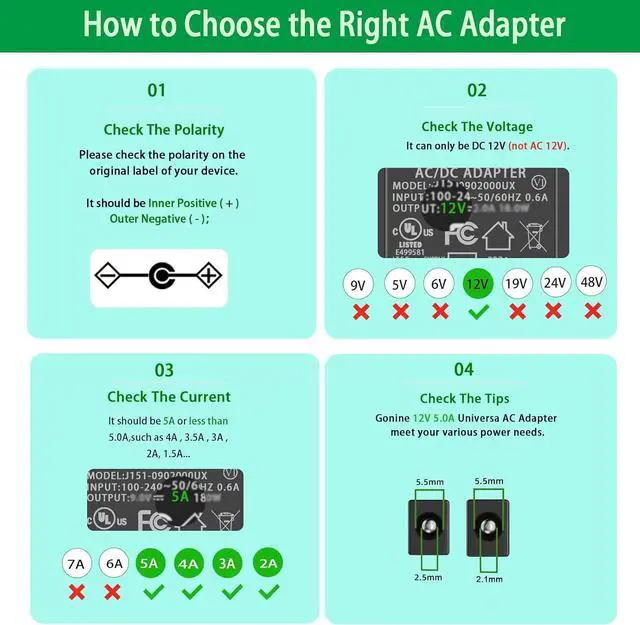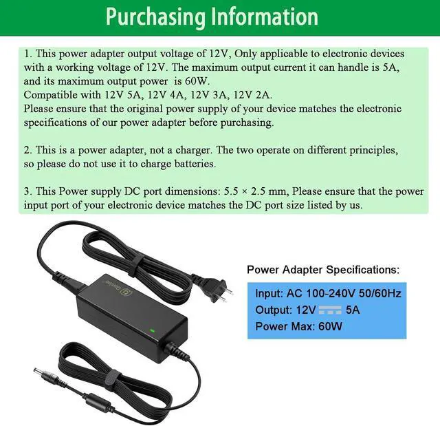 PLEASE NOTE: It is NOT compatible with devices requiring 19V or 19.5V input. Always verify your original power supply's voltage and DC port size before purchase. [Stable & Powerful Output] Delivers a stable DC output of 12V and up to 5A current with a maximum power of 60W. It seamlessly replaces original 12V 5A 4A 3A and 2A power adapters ensuring your device receives consistent and adequate power for optimal performance. [Convenient Design & Specifications] Features a standard 5.5 mm x 2.5 mm DC plug. The power cord offers great flexibility with a 1.2 -meter ( 3.9 ft) AC cable and a longer 1.5 -meter ( 4.9 ft) DC cable allowing for easier setup and placement. [Premium Safety Features] Built with multiple advanced protections including Automatic Overload Cut-off Over-Current Over-Voltage and Short-Circuit Protection. Certified by FCC CE and RoHS it ensures complete safety for both you and your electronic devices offering peace of mind during use.