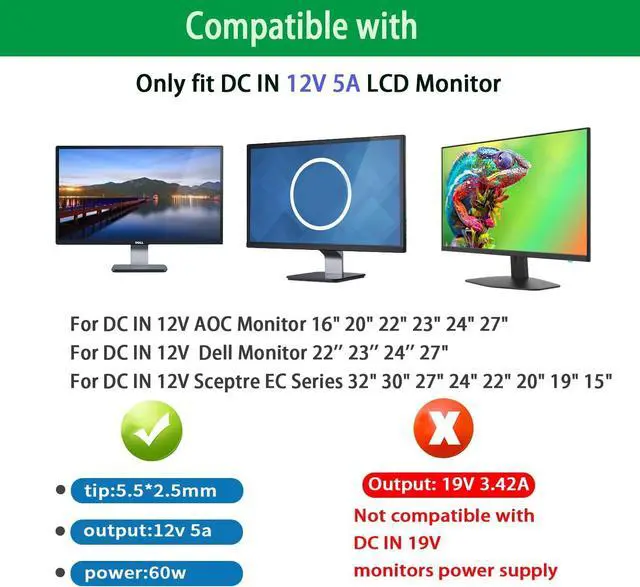 [Universal Compatibility & Precautions] This 12V 5A power adapter is specifically designed for 12V monitors. It is compatible with AOC ( 16 20 22 23 24 27) ( 21.5 22 23 24 27) and Sceptre (32 30 27 24 22 20 19 15 EC Series) LED/LCD monitors and TVs.
