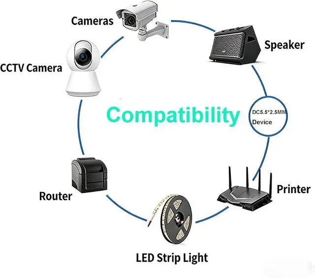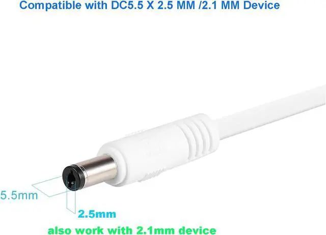 Output: 12 Volts 3 AmpsDC barrel tip round connector ( 5.5 mm x 2.5 mm/ 2.1 mm) 10 feet (3 meters) long extension cableBuilt-in smart IC chip Over voltage protection Over current protection Over-Heat protectionReplacement for Led Strip Light LCD monitor wireless router adsl Cats hub switch security camera Audio/Video power supply etcCome with 1 pcs 12V power supply