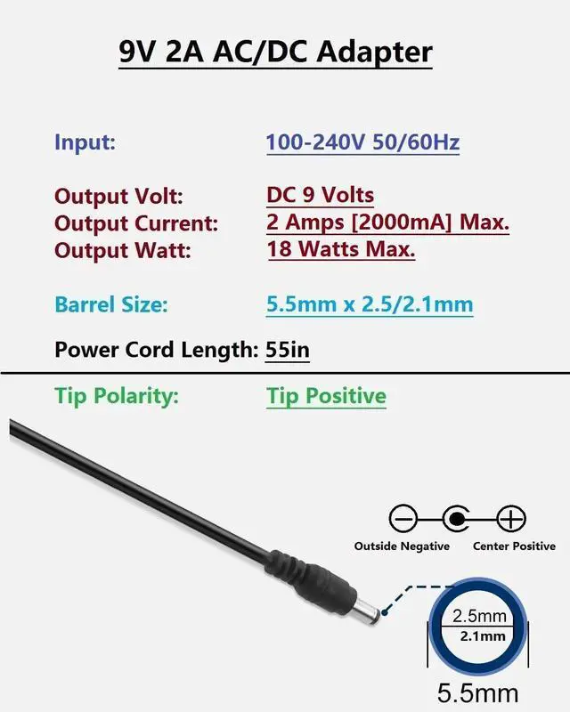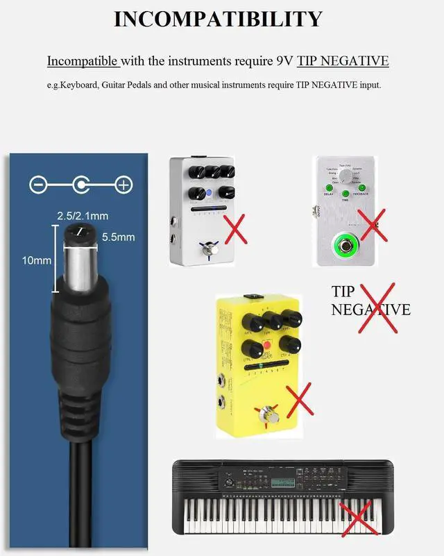 TIP POSITIVE 5.5 mm x 2.5 mm / 2.1 mm TIP POSITIVE 9V DC Power Cord with 5.5 mm x 2.5 mm / 2.1 mm barrel plug NOT TIP NEGATIVE cord. Please would make sure the polarity of your devices needed. Incompatibility Incompatible with the devices require 9V Tip Negative e. g. Tip negative musical instruments Keyboard Guitar Pedals Boss PSA pedals etc. Compatibility Compatible with Recorders Speakers CCTV cameras Radio and more devices required 9V tip positive. 9V 2A Max.