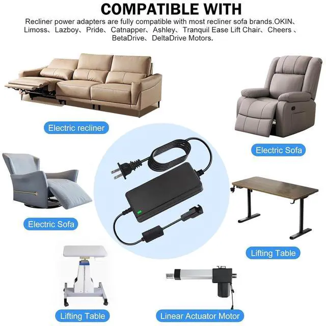 Compatibility: ychmzp recliner power supply adapter compatible with most recliner sofa brands. Such as OKIN Limoss Lazboy Pride Catnapper Ashley and Tranquil Ease Lift Chair Cheers electric sofa BetaDrive and DeltaDrive Motors.