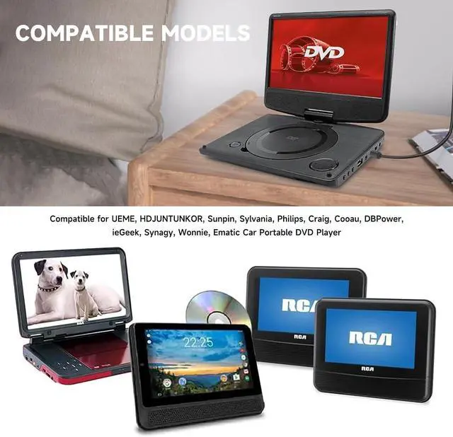 Compatible Device: UEME HDJUNTUNKOR Sumpin Sylvania Craig Cooau DBPower ieGeek Synagy Wonnie Ematic Portable DVD Player. 2.? Compatible with APEMAN PV760 PV1570 Craig CTFT713 CTFT716n COOAU CU-101 CU-103 CU-903 DR. J Professional 12.5 DBPOWER 9.5 10.5 12.1 MK101 PD116 PD928 THX-120100KE FUNAVO 918A ieGeek IK9 IK-102 NaviSkauto PD10002B Pyle PDV156BK SUNPIN 9.5 D969 SYNAGY A30 A29 Sykik SYDVD196 TENKER PD918 THZY 9001 9301 UEME PD-0091 PD-0093 PD-0091 PD-1010 PD-1020 WONNIE 9.5 10 10.5 12.5 16.5 16.9 ZESTYI ZE-102 Ematic DVD Player (NOT FOR LAPT0P) EPD116BL EPD116BU JB901PR. 3.? Compatible with Sylvania 1030 7011 7012 7014 7015 7027 7045 7047 8728 9000 9020 Series; P/N Eadp-18sb Adpv18a Asuc12a-090080 Ay4128 Ay4133 Ay4197 Ly02 Ly-02; Sylvania Pb9011/37 Pd/9000 Pd7012/37 Pd9000/37 Pd9012 Pd9012/37 Pd9012m/37 Pd9016 Pd9016/37 Pet741m/37 Sdvd1010 Sdvd1030 Sdvd1032 Sdvd1048 Sdvd1251 Sdvd1256 Sdvd1332 Sdvd1566 Sdvd7014 Sdvd7040b Sdvd7078 Sdvd8737a Sdvd8739 Sdvd9019 Sdvd9020 Sdvd9020b Sdvd9805 Sdvd 9957.4.