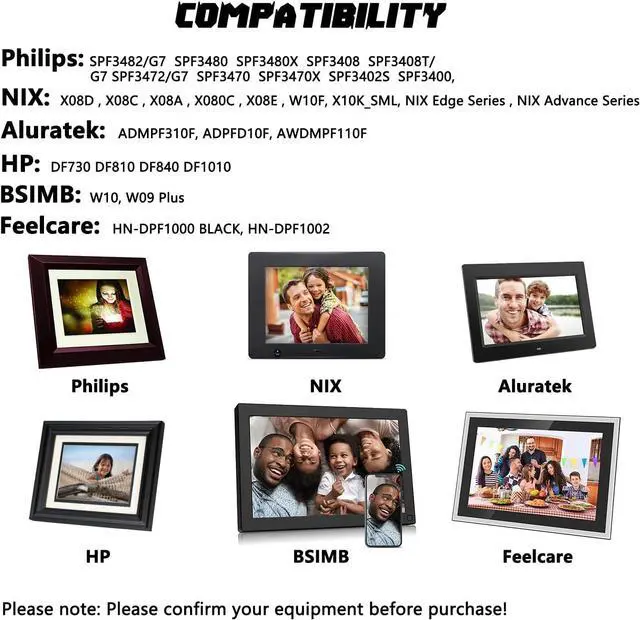 Please Note: This 5V Digital Photo Frame Power Cord NOT for 9V or 12V power cord. Not compatible with 8FF2FPB/37 8FF2FPW 8FF3FP 7FF3FP 6FF3FP Series Not for HP DF720 DF780 DF820 DF10000 Not for Nix 12 15 digital photo frame models. Please check that your model are listed before purchasing!