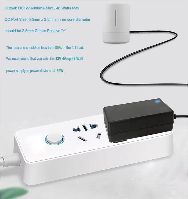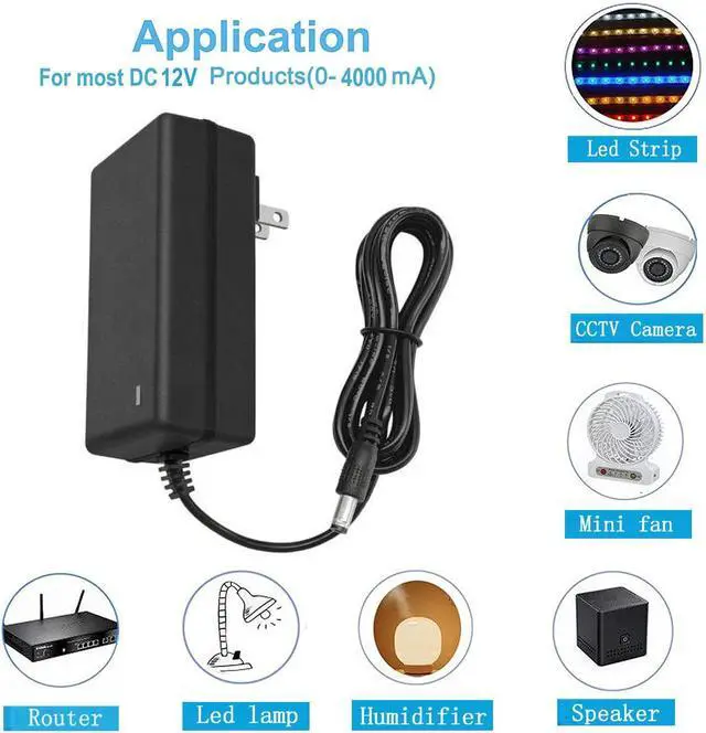 Protections: automatically overload cut-off over voltage cut-off over temperature cut-off short-circuit cut-offThis 12 Volt 4 Amp Power Adapter is perfect for dc 12V devices less than 48W such as dc 12V LED light strip CCTV security camera printer keyboard TV boxes Speakers etcWHAT