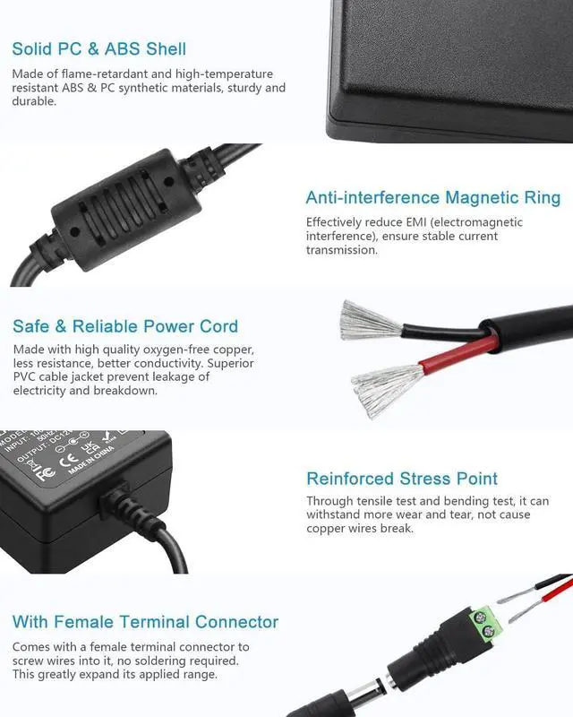 Input: 100V-240V 50/60Hz; Works with device that draws less than 2A such as 12V 1A 12V 1.5A 12V 2A 12V 3A 12V 3.5A 12V 4ADC 12V Power Cord with DC Plug size is 5.5 mm x 2.5 mm. E. g. DC output port outer diameter is 5.5 mm inner diameter is 2.5 mm. Please kindly confirm it before orderingFIVE