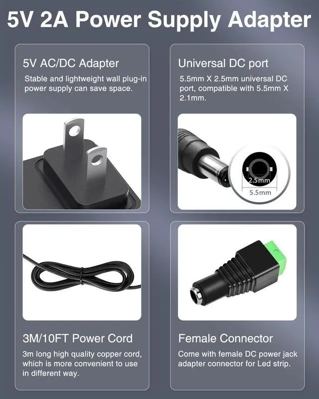 Input: 100-240V Ouput current is 2A max it means that it can supply with all amperage which smaller than 2000mAIntelligent Output5Volt 2A 1.5A 1.0A 0.8A 0.5A Switching Power Supply DC 10W Max Power supply works for various of devices which ask for a less than 5.0V 2A 10W power adaptorSafety smartflame retardant shell resistant to high temperature of 1382 premium-quality components and safe&reliable power cord. overvoltage protection and overload protectionWide Application Widely used to drive 5V LED light strings USB-HUB Bluetooth speaker wireless router mini fountain wifi IP home camera and other 5V devices less than 10WAfter sales supportPlease feel to contact with us for any questions We will solve the problems for you within 12 hours Thank you for your understanding and support